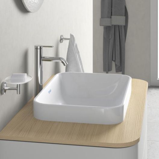 - حوض غسيل فوق الرف من ديورافيت هو حوض فريد من نوعه على شكل مستطيل يوفر نطاقًا جديدًا لتصميم الحمام.