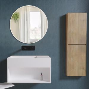 - تتوفر وحدة حوض الحمام المُجمَّعة مسبقًا باللون الأبيض اللامع أو هيكل البلوط أو الرمادي مع لمسة نهائية ناعمة غير لامعة
