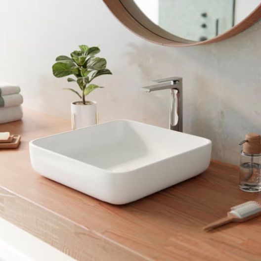 - مغسلة برنستين فوق الرف فريدة مربعة الشكل توفر نطاقًا جديدًا لتصميم الحمام.