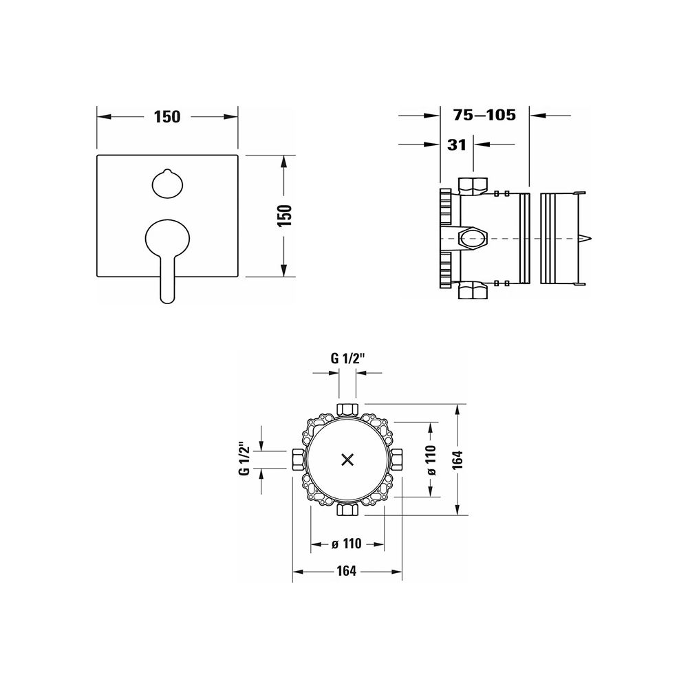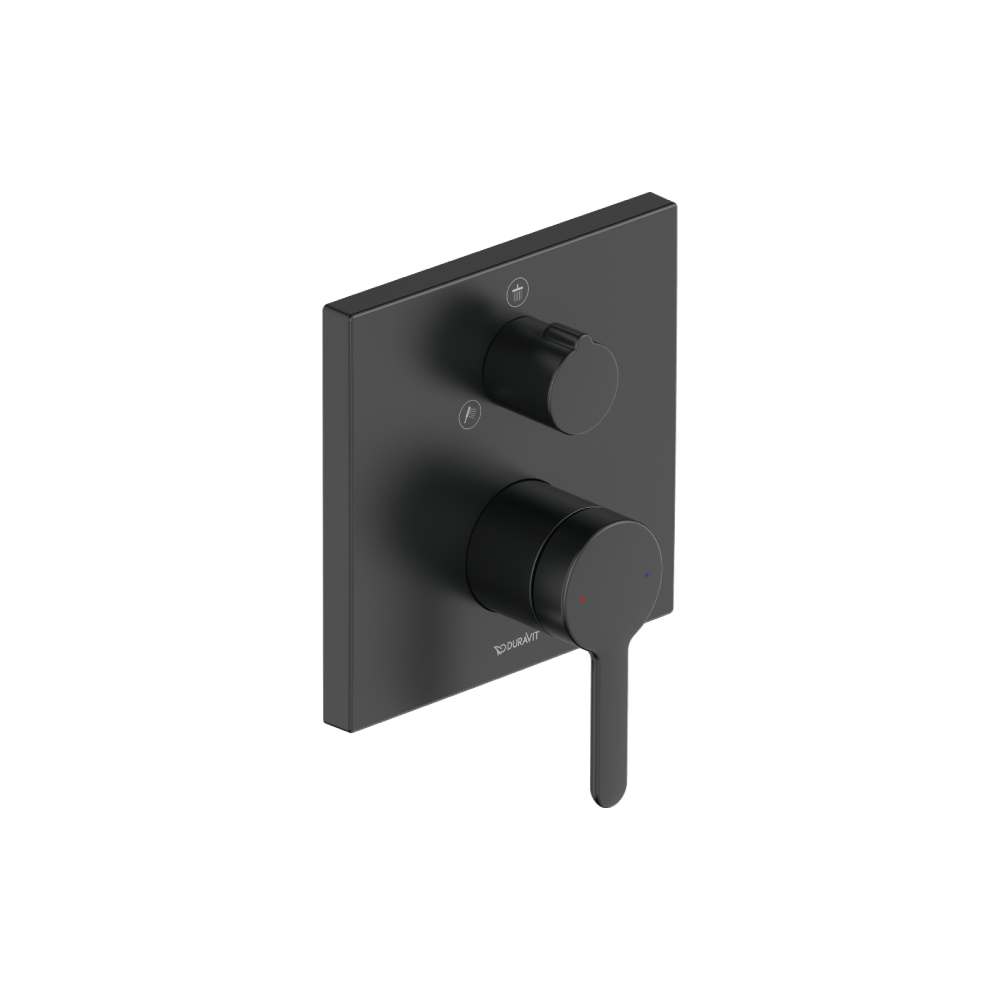 خلاط حوض الاستحمام والدش المخفي ديورافيت سي1 بمخرجين للمياه بلمسة نهائية من الاسود ، من تصميم كورت ميركى جونيور يشتمل على جزء مخفي ومجموعة تثبيت.