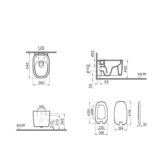 كرسي حمام بدون حافة مثبت على الحائط من فيترا ٥٤.٥(عمق) x ٣٦(عرض) سم - رمادي مطفي كراسي الحمام