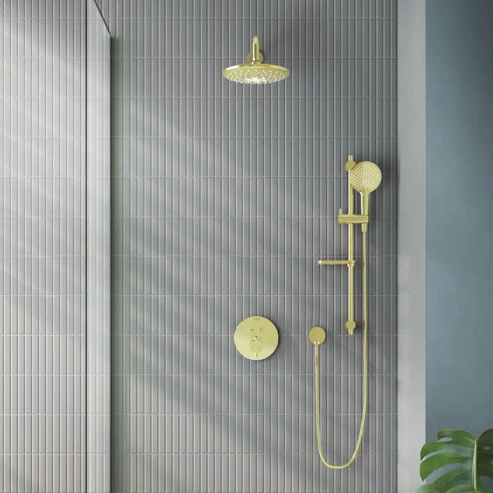 دش مطري دائري مثبت على الحائط قطر 25 سم يشمل ذراع الدش المثبت على الحائط من فيترا - اللون ذهبي لامع. التركيب الاختياري متوفر عن طريق خبرائنا المعتمدين.