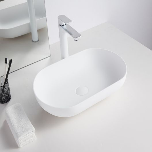 Bernstein full set wall mounted bathroom vanity includes waterproof cabinet in concrete grey matt, 90(W) x 55(D) cm and a matt white solid stone wash basin 54(W) x 34(D) cm, basin siphon and fixing kit included. Optional expert installation is available.