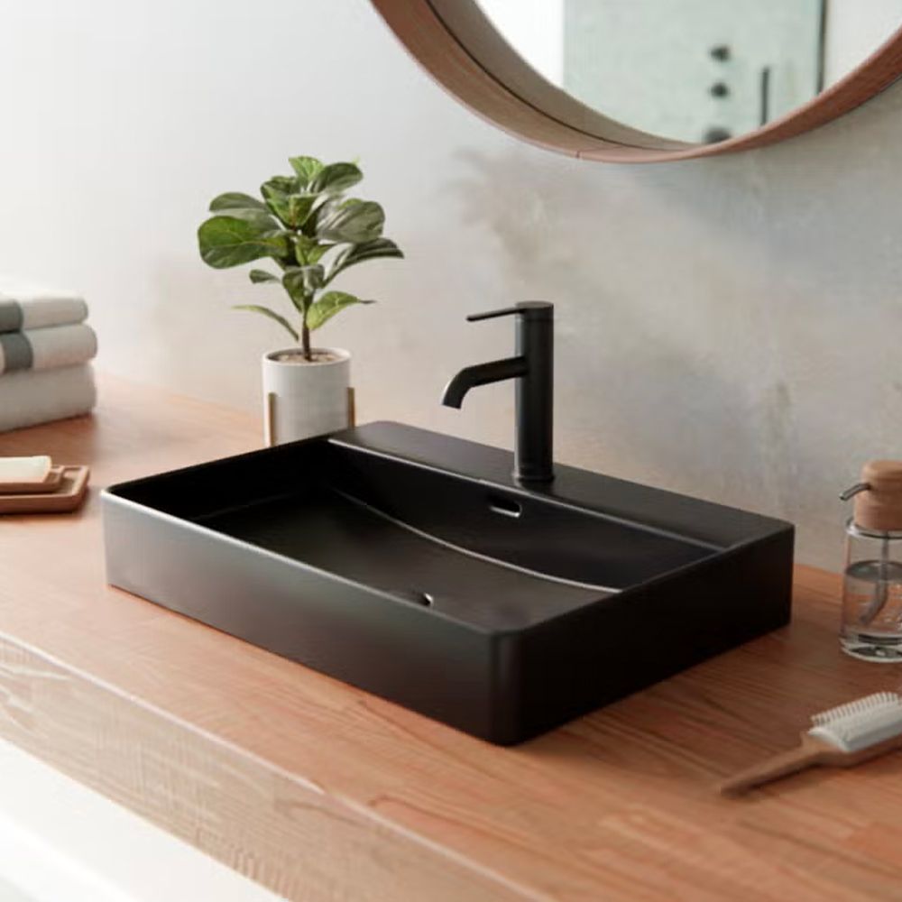 Bernstein countertop washbasin size: 50(W) x 42(D) x 12.5(H) cm. This unique rectangular-shaped basin is made of top-quality sanitary ceramic in Matt Black. Including pop-up waste, siphon and fixing kit. Optional expert installation is available.