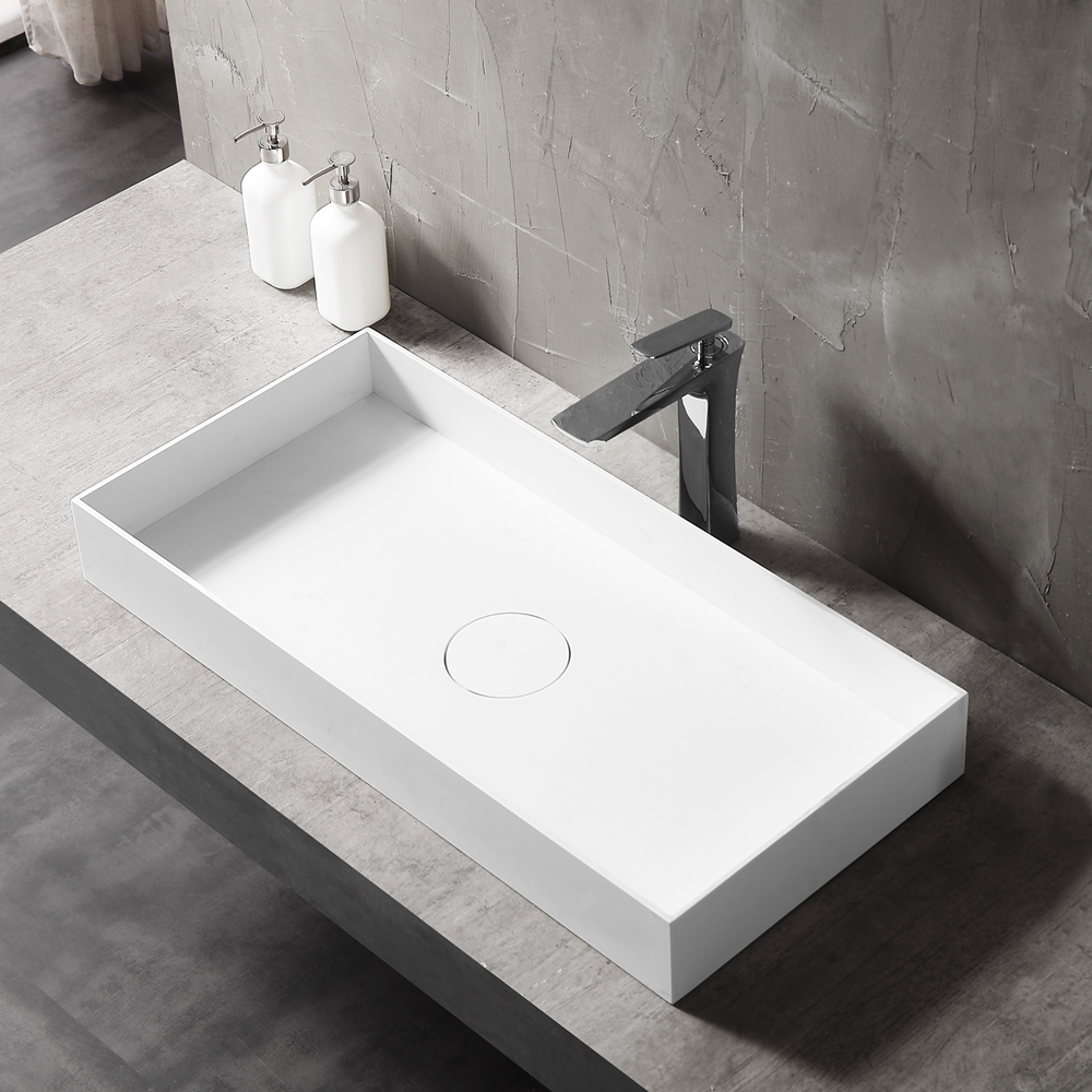 Bernstein countertop washbasin size: 80(W) x 38(D) x 10(H) cm. This unique, rectangular basin is crafted from high-quality solid stone in matte white. It comes with a pop-up waste, siphon, and fixing kit. Optional expert installation is available.
