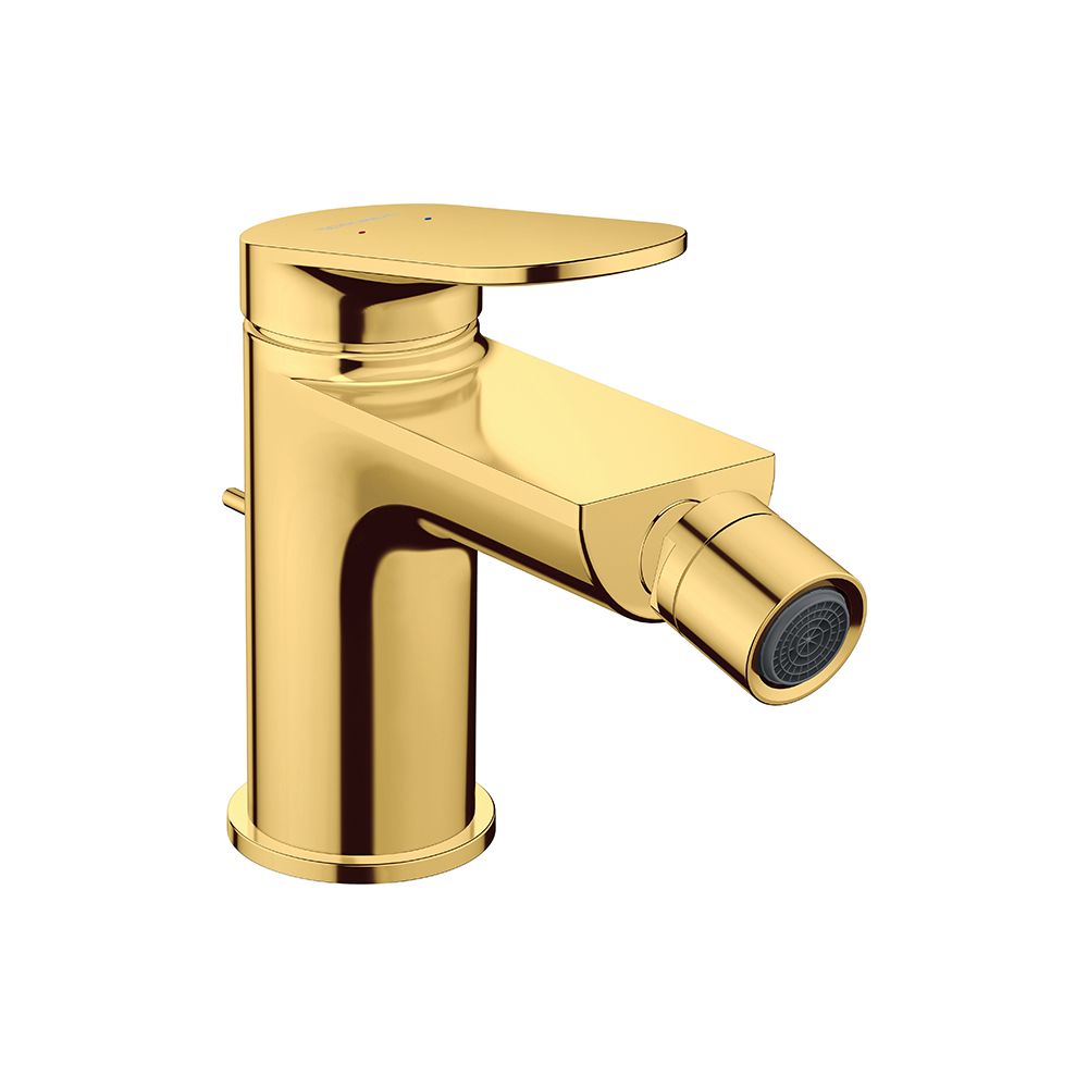 Duravit Wave bidet mixer tap in shiny gold color, designed by Duravit. Includes pop-up waste, flexible hoses and fixing kit. Optional expert installation is available.