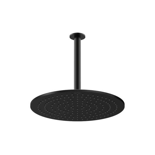Duravit ceiling mounted round head shower 30cm Ø made of metal in matt black finish, designed by Duravit. Includes ceiling mounted shower arm. Optional expert installation is available.