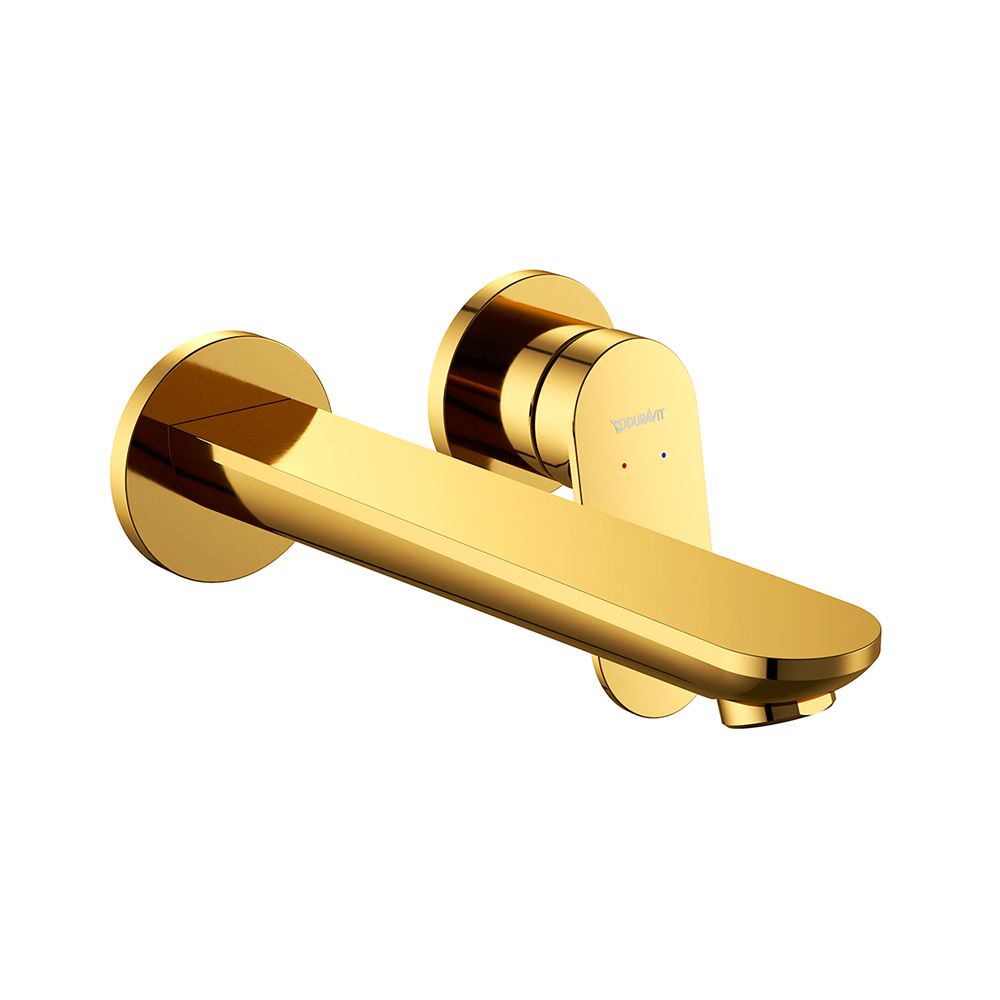 Duravit Wave single lever wall mounted wash basin mixer tap in shiny gold color, designed by Duravit. Includes concealed part and fixing kit.