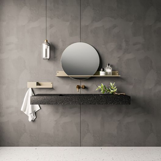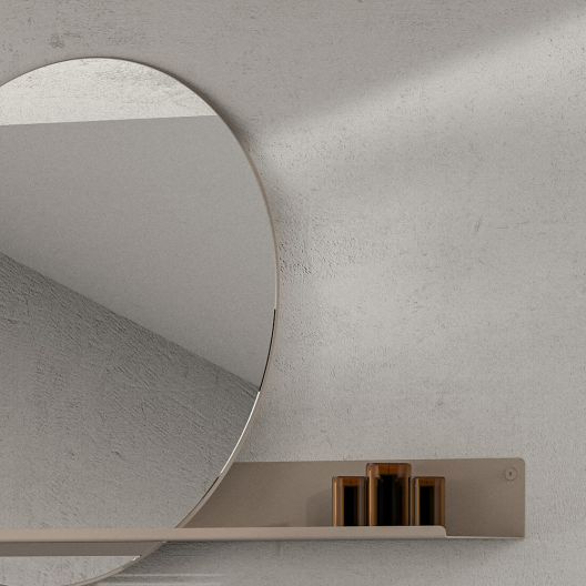 Fink London, a versatile wall mounted mirror with a modern shelf, is perfect for bedrooms, bathrooms, or offices. Store makeup or jewelry while enjoying its classic round design and adjustable placement. Size: M (shelf 60 cm/mirror 37 cm) in sand grey. Optional expert installation is available.
